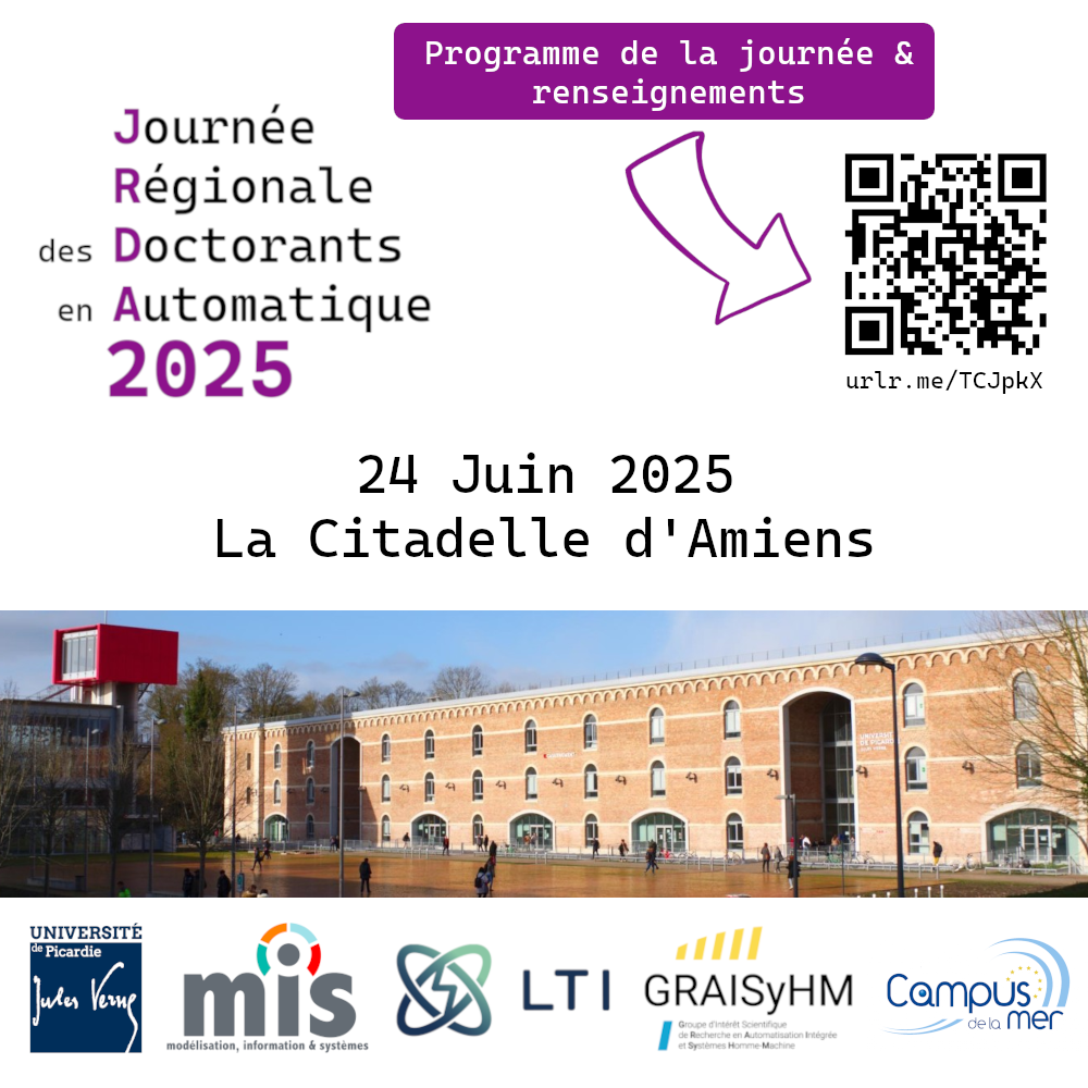 La Journée Régionale des Doctorants en Automatique se déroulera à Amiens le 24 Juin 2025. Au cours de cette journée les doctorants en génie informatique, automatique et traitement du signal (la section 61 CNU) auront la possibilité de présenter leurs travaux de thèse au travers d'une session poster. Ainsi, les doctorants pourront bénéficier des retours de la communauté régionale sur leurs travaux de thèse.
